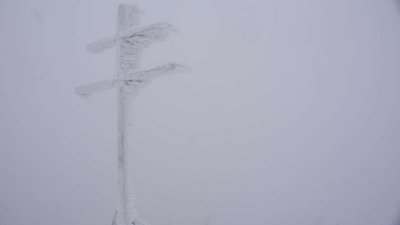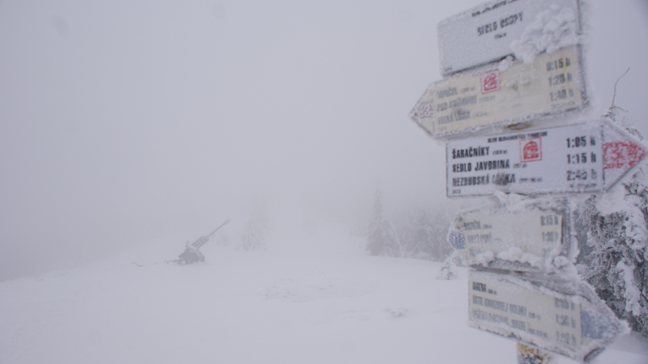 Dôverne známu, žltým snehom žlto značkovanú trasu z Fačkovského sedla cez Reváňske sedlo na vrchol Kľaku extra nesilíme. Nie je tu teľo snehu ako bolo na Minčole, skrátka nie je až tak dôležité citlivo vnímať každý krok, stačí sa len usmievať. Citlivé vnímanie a úškľabky sú však celkovo na dve veci, v duchu „Kupředu, levá, zpátky ni krok!“ naberáme výškové metre. Nakrátko spočinieme v Reváňskom sedle. Slnečné lúče, výhľady na Turčiansku kotlinu i vzdialené Tatry nám porciujú prospešnú dávku energie. Z Reváňskeho sedla na Kľak je to skutočne na skok. Doskáčeme k TIM Pod Skalou a v okamihu je mi úplne jasné, že z výhľadov dnes nebude nič. Na vrchole sme o niekoľko minút, ľudí je tu vcelku požehnane. V mihu stihneme zopár spoločných vrcholových fotiek. Len fotiek, vrcholovica v zhmotnení tekutého svetra jednoducho nie je. Od vlastnej manželky to mám dokonca vyčítané!